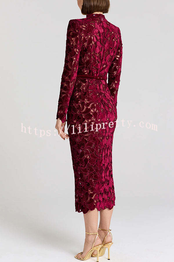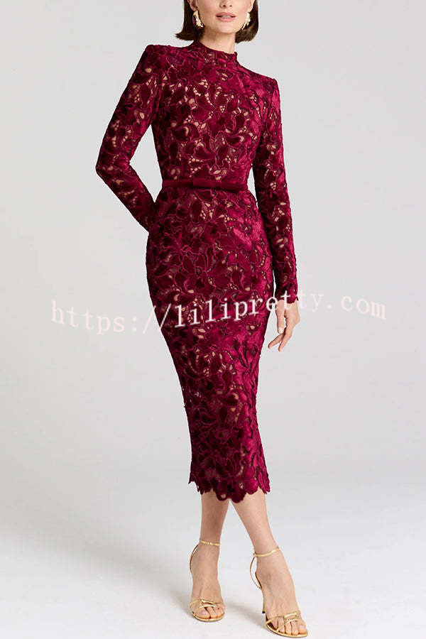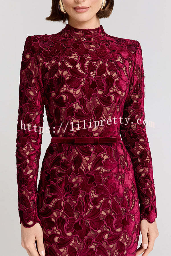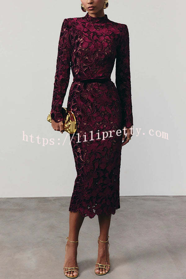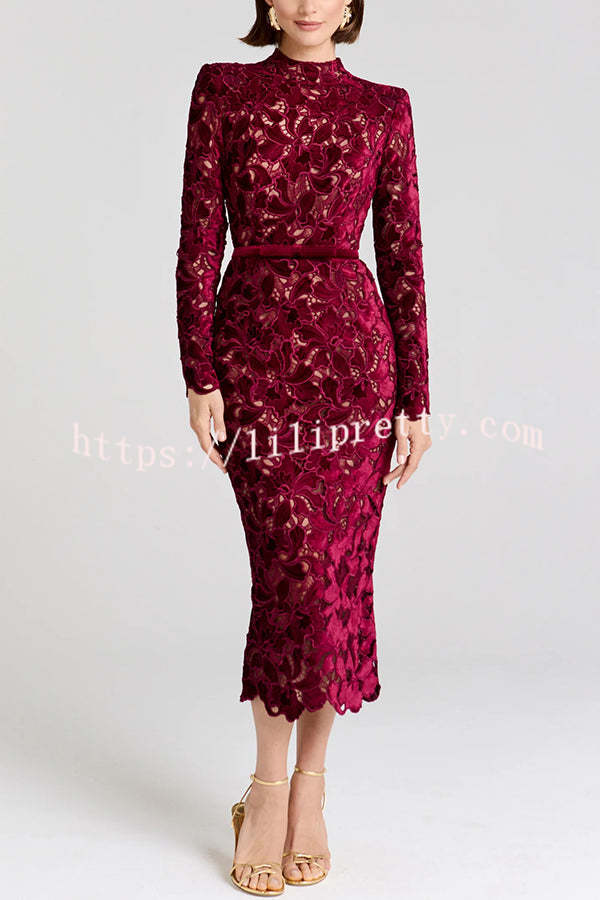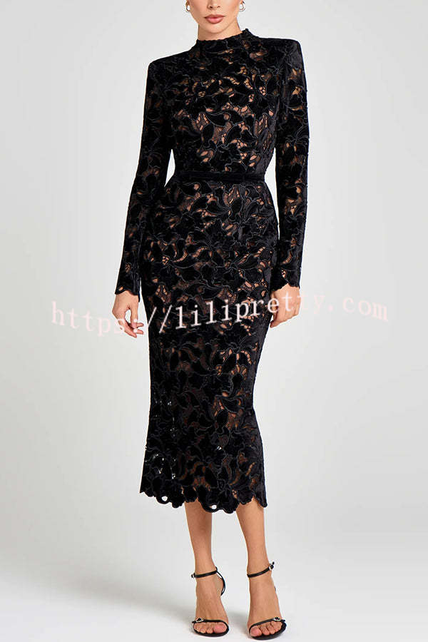 - Take a look at this black DIANE dress! Crafted from velvet embroidered lace, it offers a subtle glimpse of skin and can be worn with or without a nude slip for added coverage. This lace midi dress features a high neckline and built-in shoulder pads for a structured look. The long-sleeved midi dress is detailed with scalloped edges at the cuffs and hem for a timeless elegance. It features a hidden zipper closure at the back and a detachable belt for a versatile and elegant look.