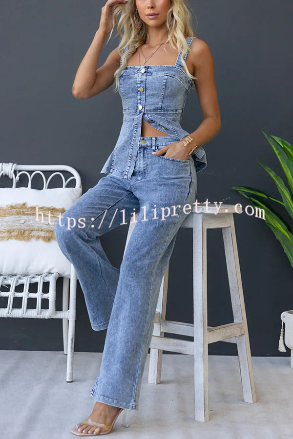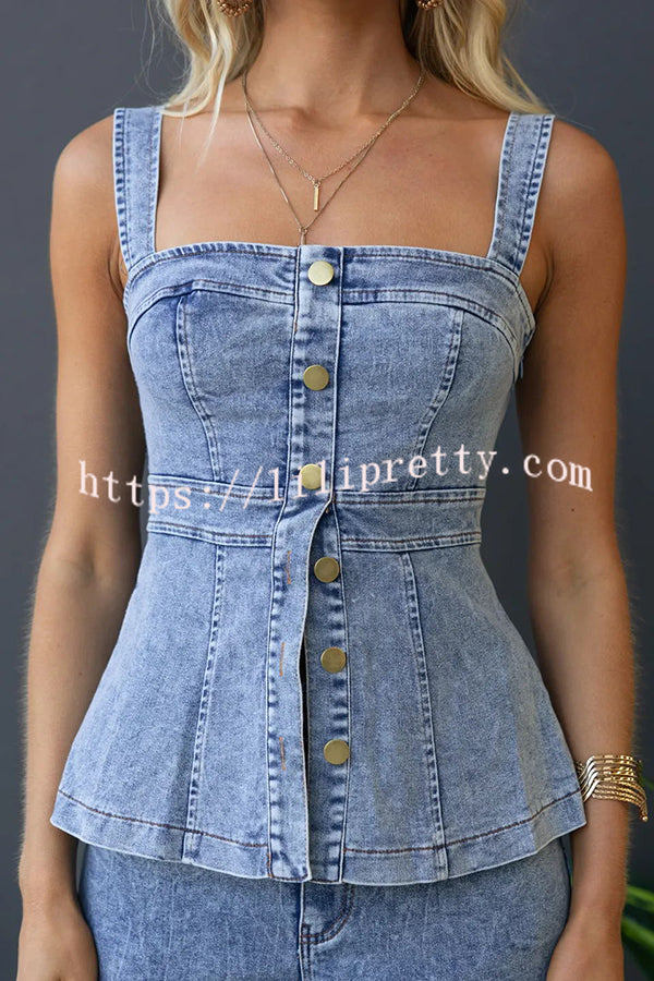 - Introducing the denim button-down top, a modern essential for your wardrobe rotation.