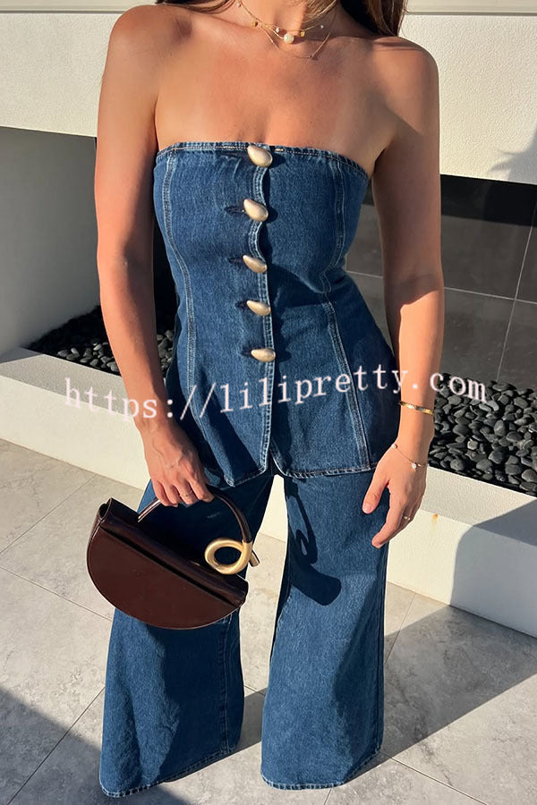 - Introducing the LENNOX Strapless Longline Button Top, a sophisticated piece that effortlessly combines style and elegance. Featuring a chic strapless neckline, this top beautifully highlights your shoulders and collarbone, creating a flattering silhouette. The button front adds a classic touch while allowing for a customisable fit. Designed in a longline style, this top offers a sleek, fitted shape that perfectly contours the body, making it suitable for both day and evening wear. For a polished ensemble that showcases effortless style, pair it with the Jen Wide Leg Flare Denim Jeans.