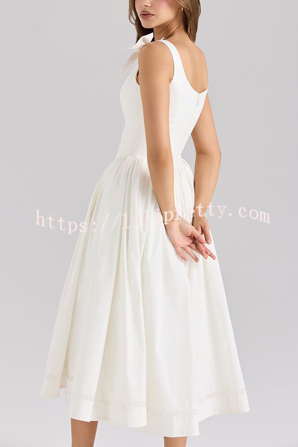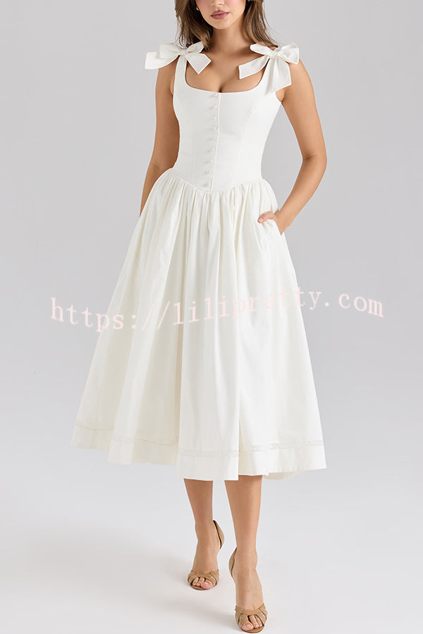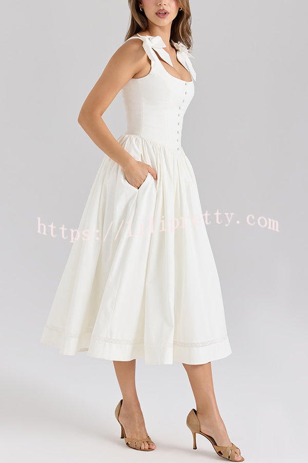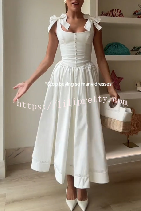 - This striking midi dress is crafted from stretch cotton to move with ease. The structured bodice is expertly crafted to hug your curves and has fabric buttons strategically placed at the front. The skirt falls from the hips and blends into the delicate silhouette, with soft tulle lining and delicate lace trims above the hem. The adorable bows on the straps are our favorite and we can't hold back - this dress is a sunny, active everyday choice.Our distinctive clothing will add instant style to your wardrobe .