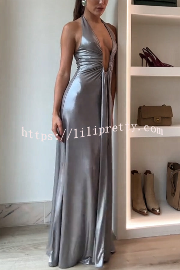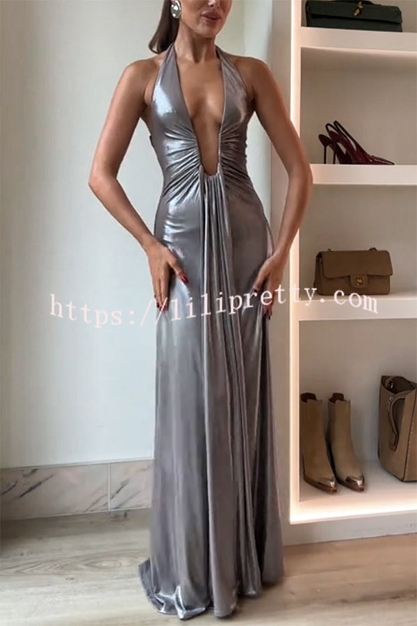 - This new icon from the brand is innovative with its plunging halter neckline featuring adjustable wire and waterfall waistband detail. Pushing boundaries with her long clean lines, it subtly exposes the wearer's cleavage. Pair it with a pair of embellished heeled sandals for an effortless yet impactful look. It's the ultimate party dress that transitions from daytime events to evening occasions.