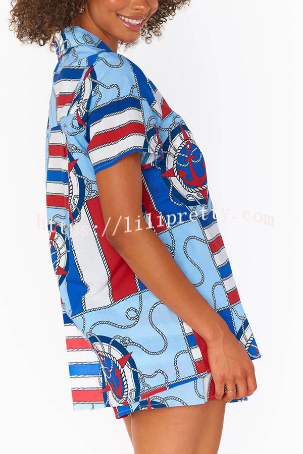- Kick off beach season looking super cute in our Home And Away PJ Set. This fun co-ord set is created from a lightweight drapey fabric, perfect for all those summer adventures. Fabric decorated with a nautical print shapes an oversized collared top with a button front and chest pocket. A relaxed short with an elastic waist and drawstring complete the look.