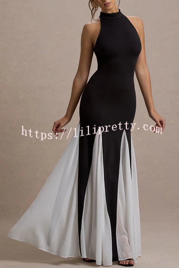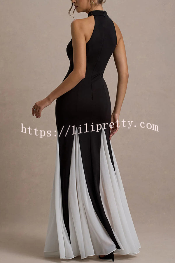 - Defined by striking contrasts and refined elegance, Litzy is a show-stopping choice for any formal affair. Crafted from our premium stretch crepe, this black high-neck maxi dress flatters the figure while offering all-day comfort. The design is elevated with a delicate white chiffon trim that adds a touch of softness and sophistication, framing the silhouette with graceful detail.