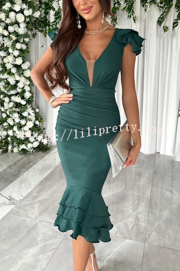 - Featuring a unique pencil cut, this elegant dress is perfect for celebrations such as weddings, communions, baptisms and other special occasions. The ruffles on the sleeves and bottom add to the lightness, and the ruffles at the bottom accentuate it beautifully, giving it a sexy character. The dress has mesh at the neckline and lining. This dress has so many fine details that you will definitely not find another like it.