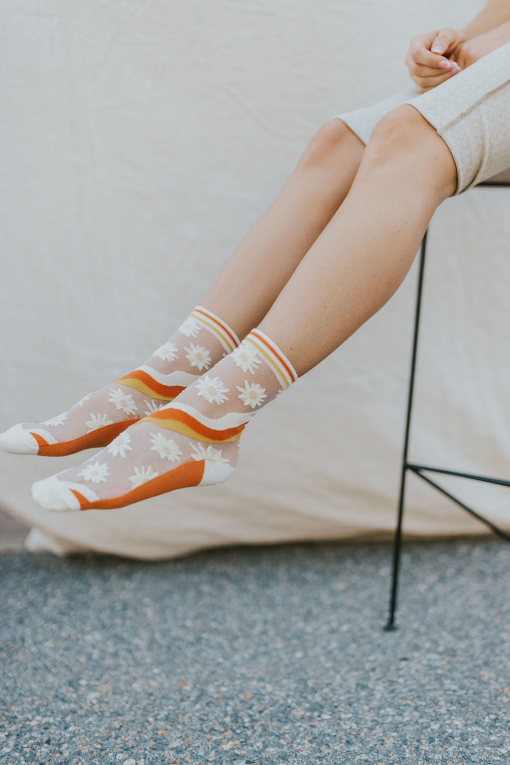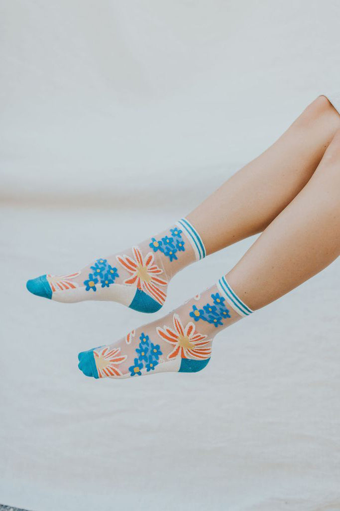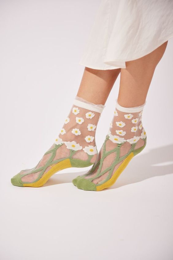 Partly sheer sock with colorful details. Soft sock bottom. Ribbed colorful cuff. Available in multiple colors