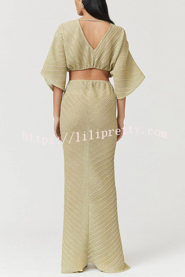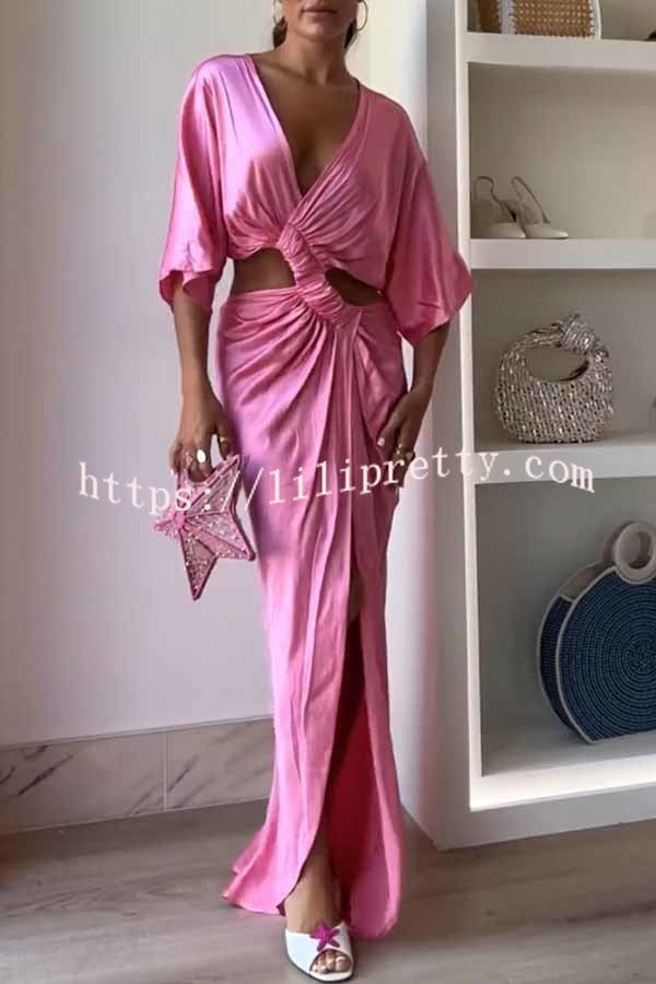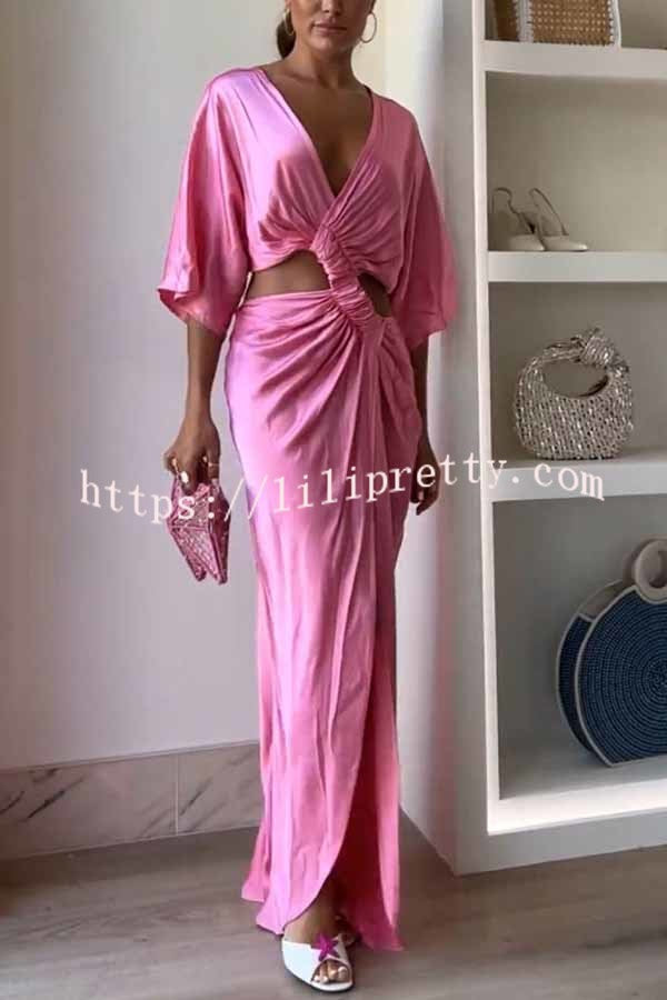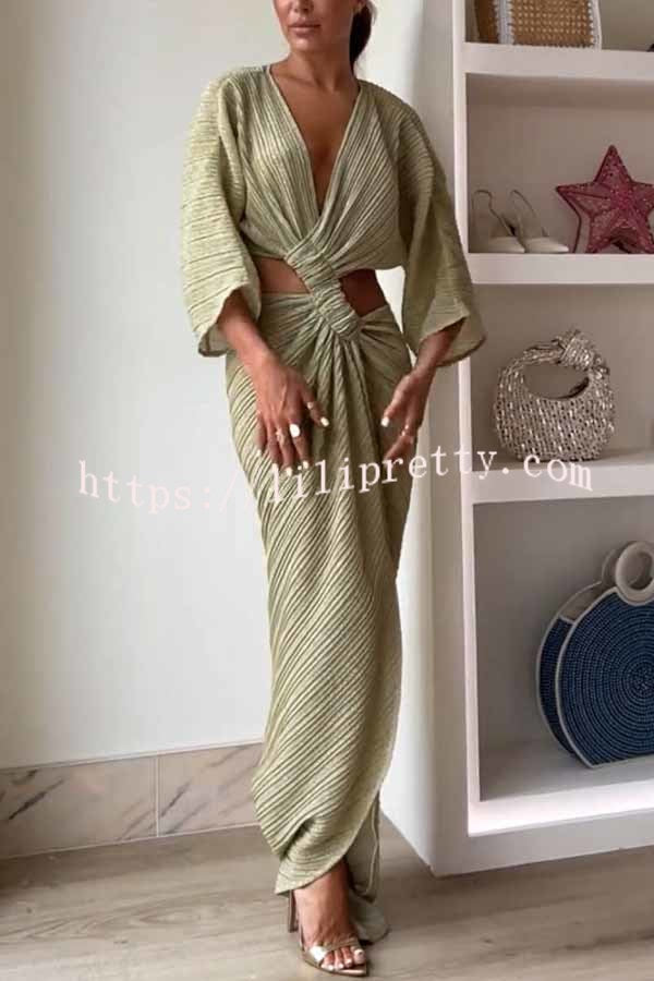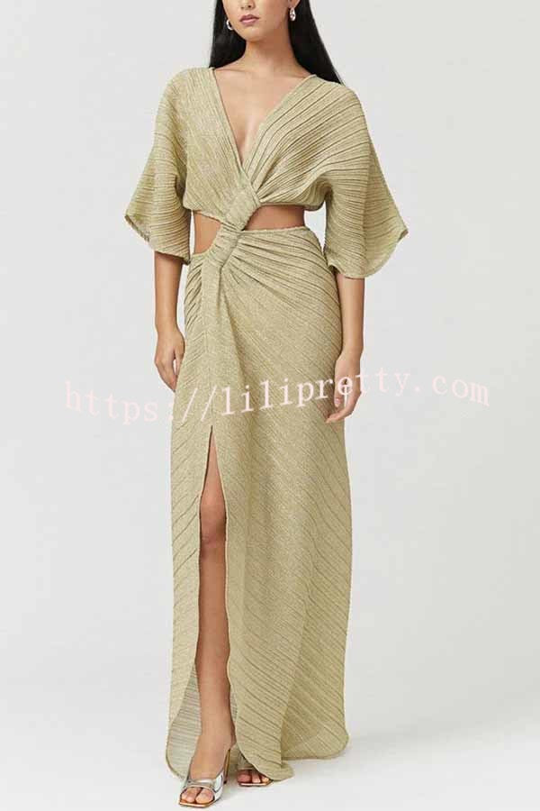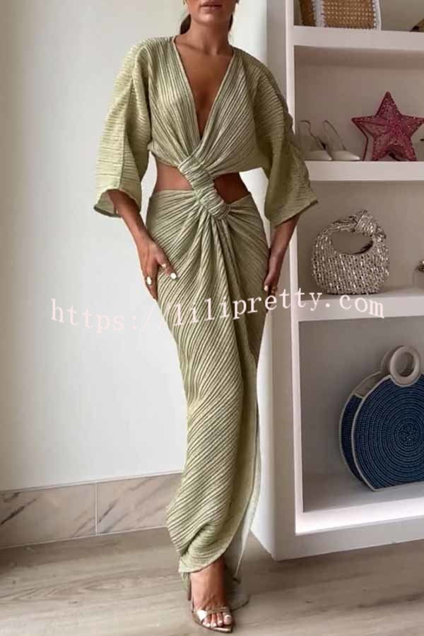 - This crossover maxi dress features a pretty V-neck, mid-length flowy sleeves and a center twist detail at the front. Cutouts at the sides and back and a flowy front