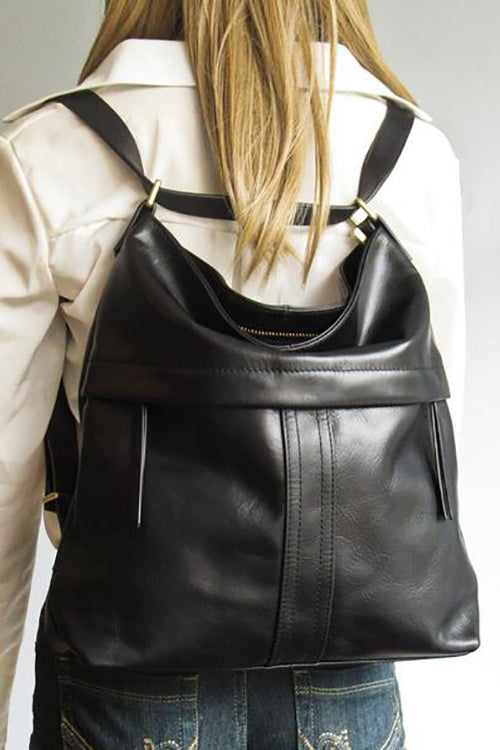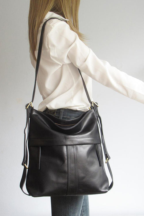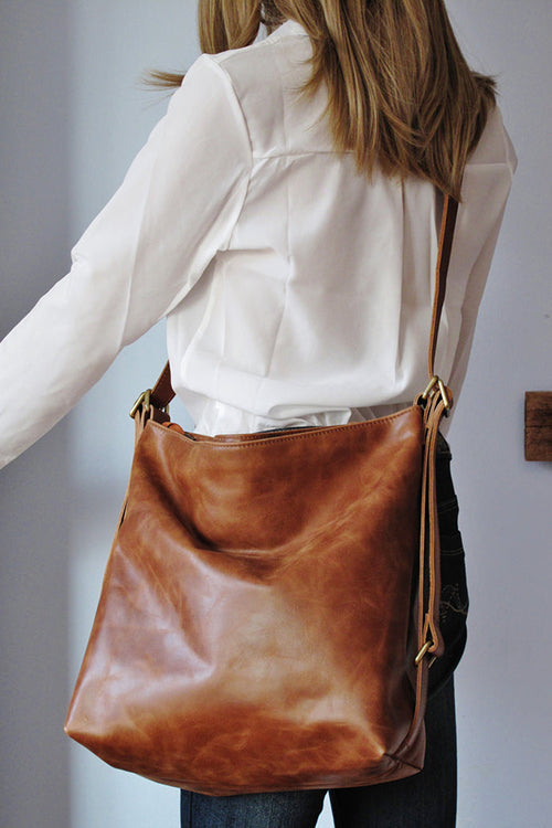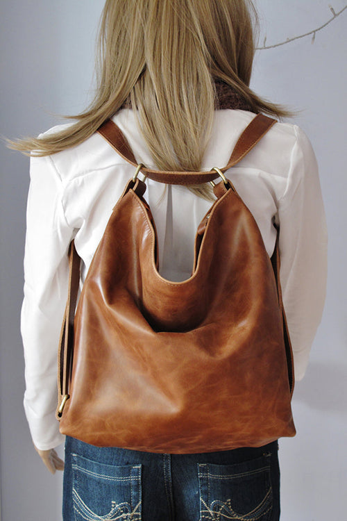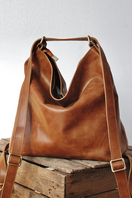 Made with a vintage-look, upholstery-weight distressed leather which ages beautifully. Wonderfully versatile: can be worn 3 ways - shoulder length, crossbody or handsfree as a backpack.