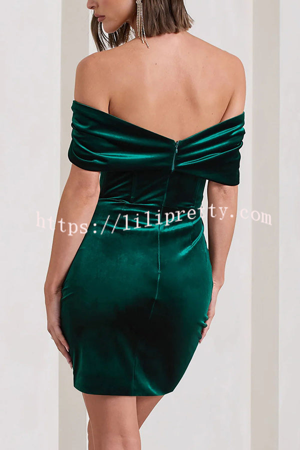 - Glisten under the evening lights in our stunning velvet mini dress. Designed in luxurious velvet fabric, this bottle green dress features a bardot neckline wrapped by an oversized bow, sculpting waist seams and a fitted wrap skirt.?