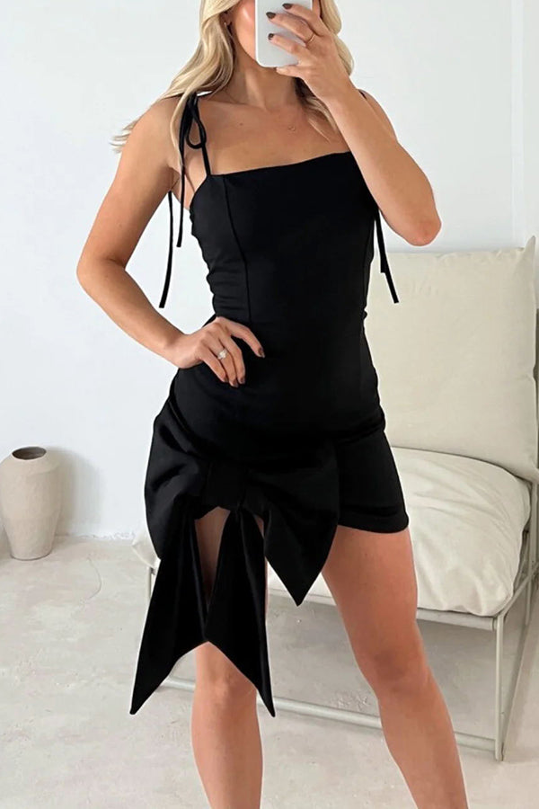 - Feel fancy and festive in this bow mini dress! Crafted with gorgeous stretch fabric, this spagetti strap dress is finished with chic structured bow hem drape to give your look a stylish upgrade this season.
