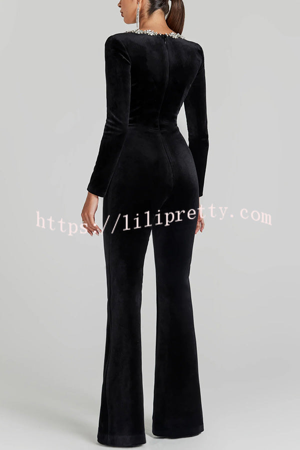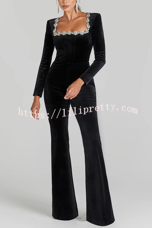 - This sophisticated design is tailor-made for endless celebrations. This luxurious black velvet jumpsuit features a square neckline, bold bejeweled trim, padded shoulders and an internal bodice bone at the bodice for shape and support. It features flared pants and a zipper at the back for a stylish look.