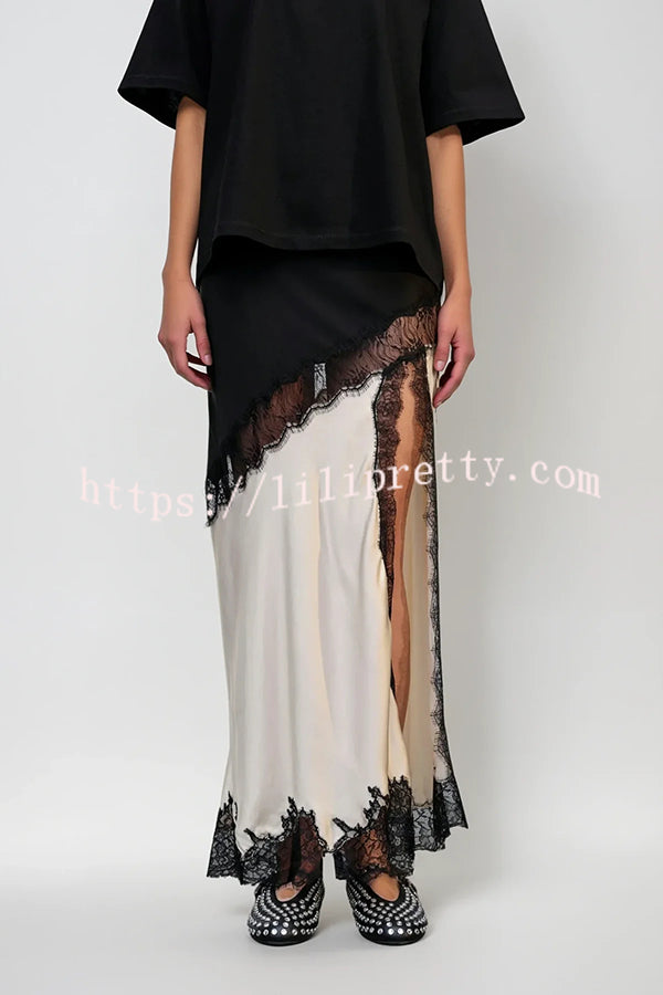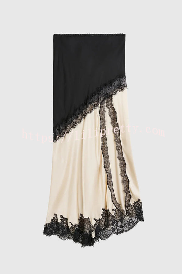 - This elegant lace and satin skirt blends delicate lace with silky satin for a sleek, sophisticated look. The soft fabric and feminine design combine comfort and style, making it a versatile addition to any wardrobe. Perfect for special occasions or everyday wear.