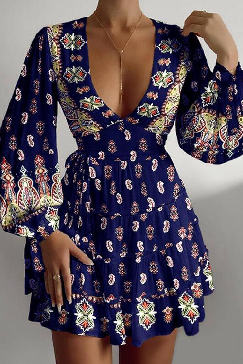 Print Deep V Neck Puff Sleeve Mini Dress