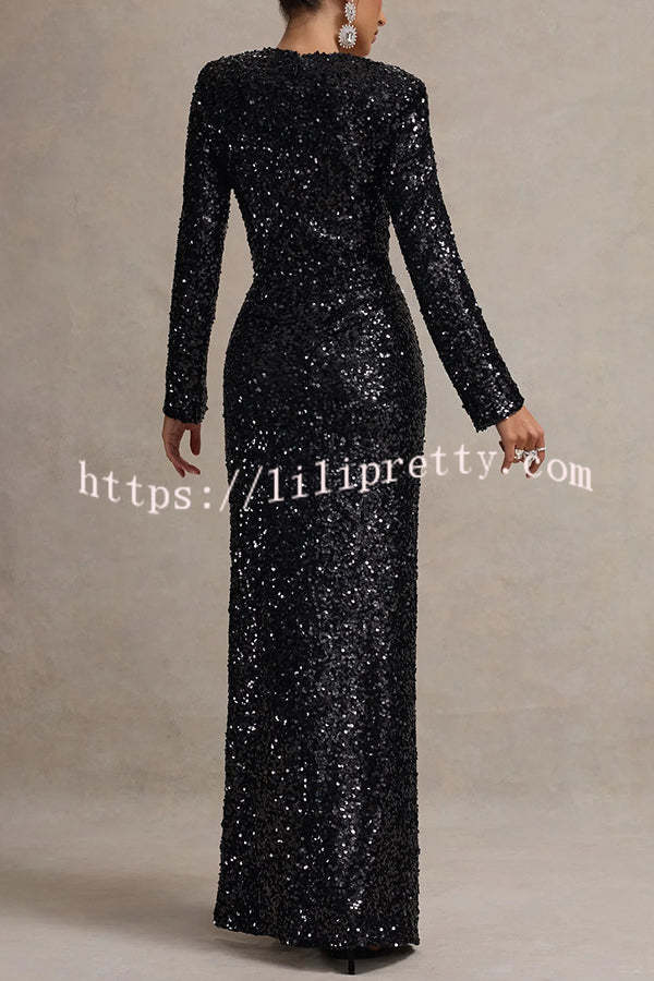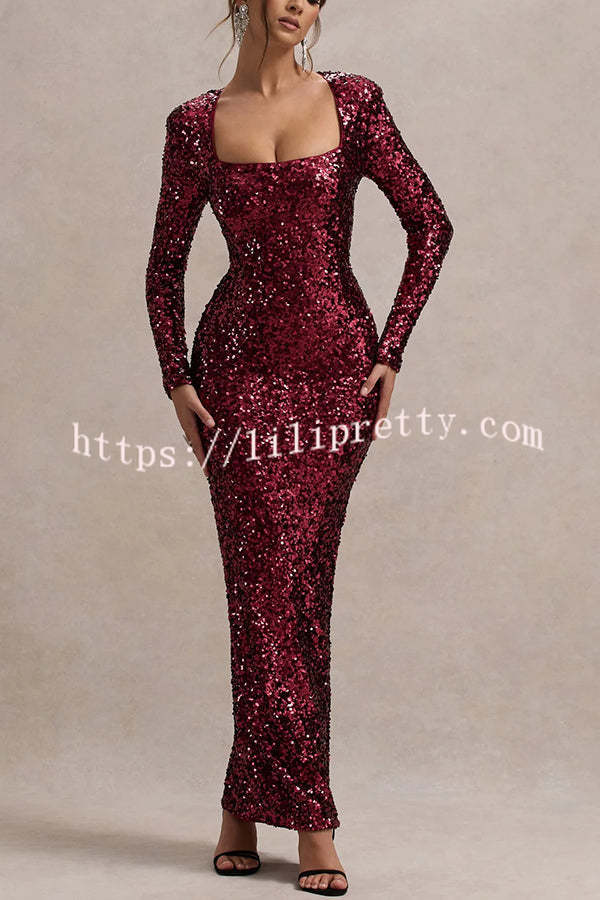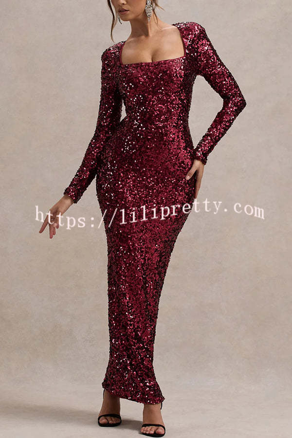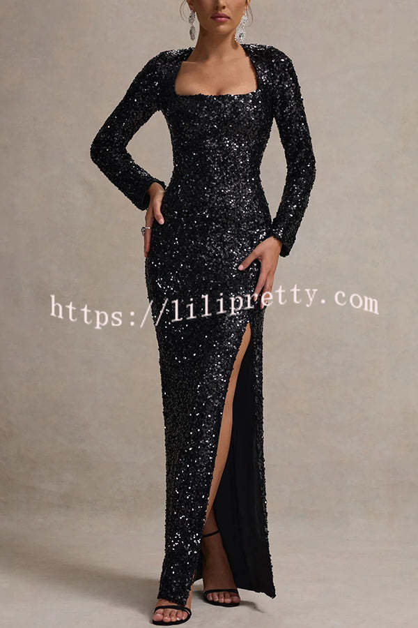 • Glittery sequins grace the dance floor and make My Dream party-ready. Featuring a sculpted square neckline, delicate shoulder pads and long sleeves, this black maxi dress is the epitome of elegance..