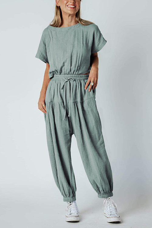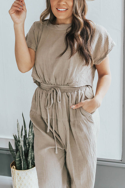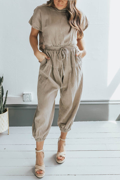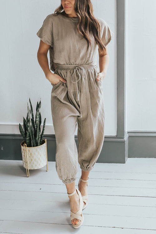 This organic neutral jumpsuit is the perfect throw together outfit for an easy yet flattering look. High boat neckline compliments a slanted short sleeve. Detached overlapping back creates a slimming silhouette. Elastic drawstring waistband shapes a relaxed jogger style bottom with elastic ankle cuffs. Function included with side pockets. this one piece is great for fall days full of shopping and lunch dates. Pair with a sneaker or mule.