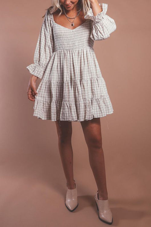 Checkered print is taking over the spring and summer seasons! This sweetheart, smocked neckline and tiered skirt creates a very chic babydoll style dress. The taupe checkered print is very versatile for wear now and later.