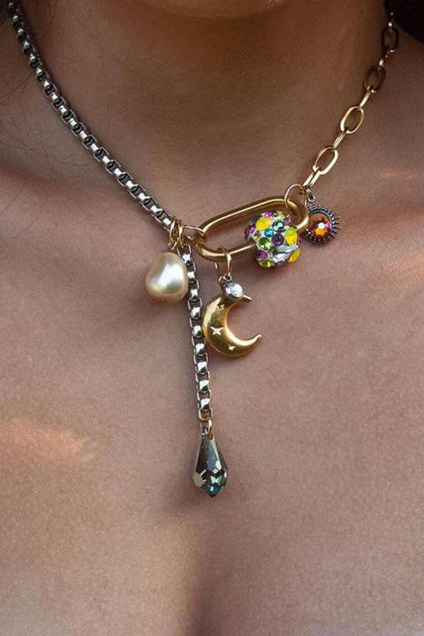 Stay stylish with this multi-element patchwork necklace! This beautiful necklace is made of stars, moon, pearls and other accessories. This stunningly beautiful necklace will bring a fresh and sweet look to your wardrobe!