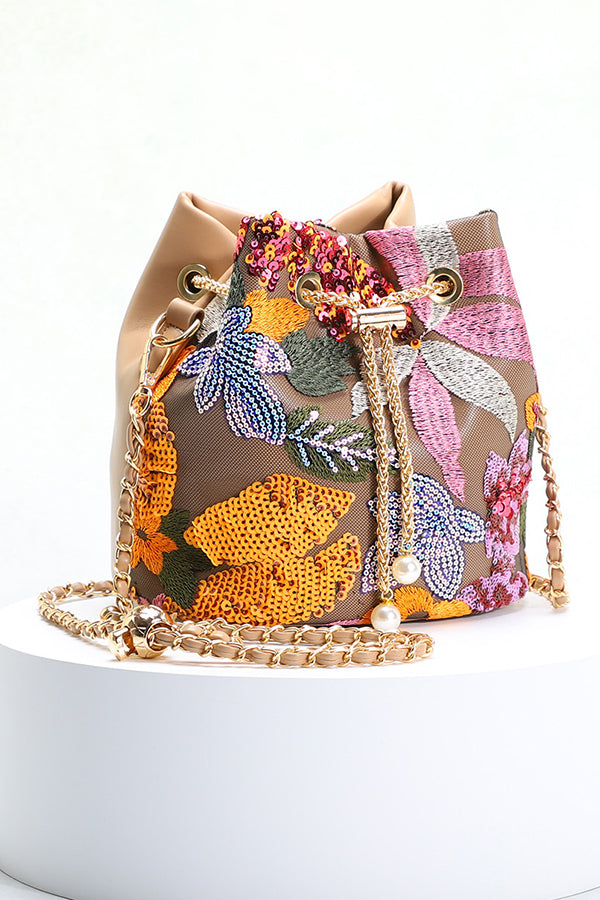 This stylish sequined PV leather chain bag. Features sequins, embroidery and other elements. Also comes with an extra-long metal shoulder chain. Can be used as a clutch or crossbody bag!