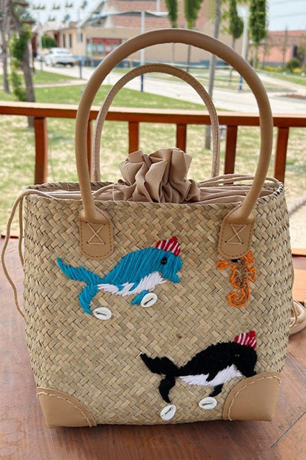 This hand-embroidered straw bag. Made by hand weaving. Also features a fabric drawstring lining. Can be worn as a clutch or shoulder bag!